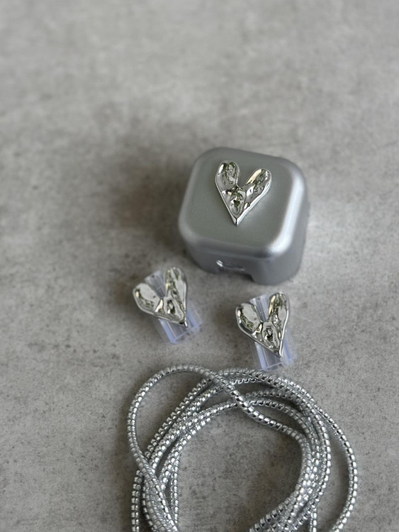 ست محافظ شارژر آیفون با طراحی فانتزی قلب برجسته نقرهای، یک انتخاب خاص برای محافظت و زیباسازی لوازم شارژ. این پک شامل موارد زیر است: